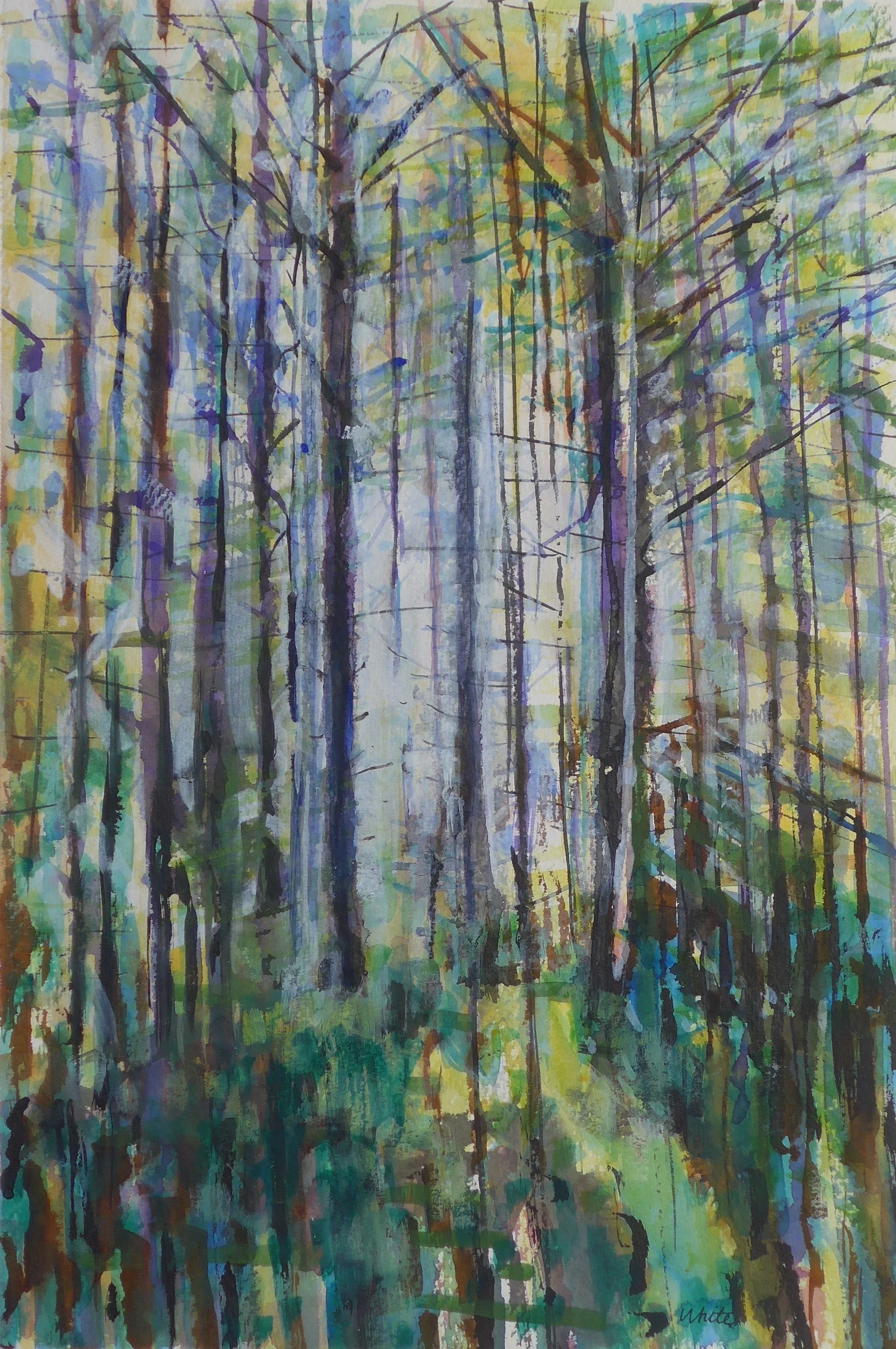 Steve White is a British artist who explores landscape through the interplay of time, light and colour. His paintings, etchings and lithographs reflect a long standing engagement with the natural world and its shifting atmospheres. Shropshire, with its diversity of woods, rivers, hills and unique habitats such as the Whixall Mosses, are a constant source of inspiration. But his work is not limited to these subjects for during his widespread travels he may be inspired by mountains, coastlines or cities he encounters resulting in both figurative and abstract works such as recent a ‘Venice’ series. Drawing is a skill which he constantly practices for this determines the control of gesture and quality of outcome of even the most abstract brushwork. Drawing, including pastel, also leads from time ot time to some one off projects, in other fields, such as studies of ballet and dance.